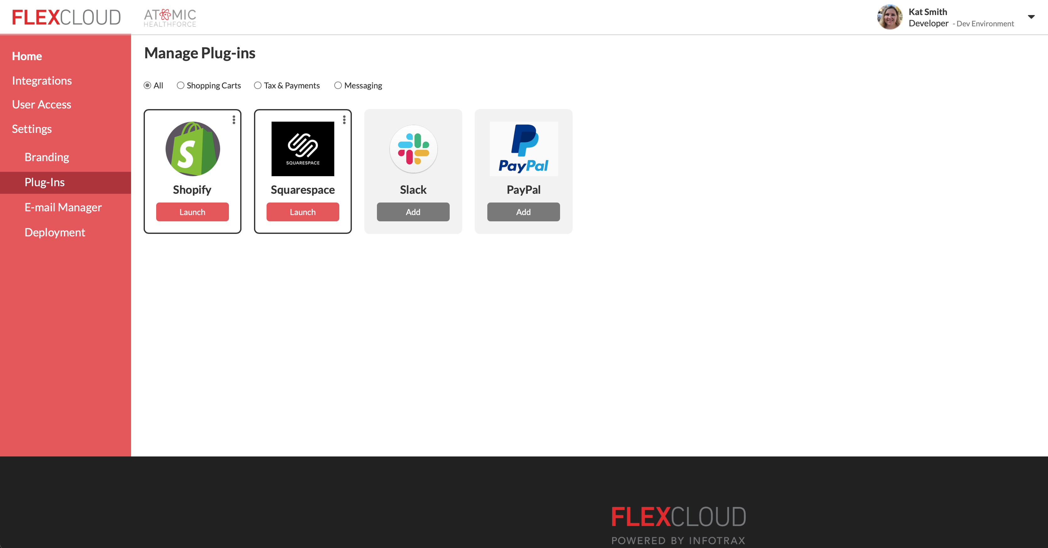 FlexCloud is a rethinking of the way InfoTrax does business with clients. Previously, clients would sign up for any number of products offered by InfoTrax (storefront, commissions engine, etc.) and work with InfoTrax to customize the base products to their needs. This worked well with a modest group of clients, but as the company grew, it became increasingly difficult to offer the same level of service to each client. In order to streamline development and offer more freedom to clients, we developed an SDK that could be implemented by the client with any front end or commissions engine of their choosing and a user facing portal to set up integrations and plug-ins.